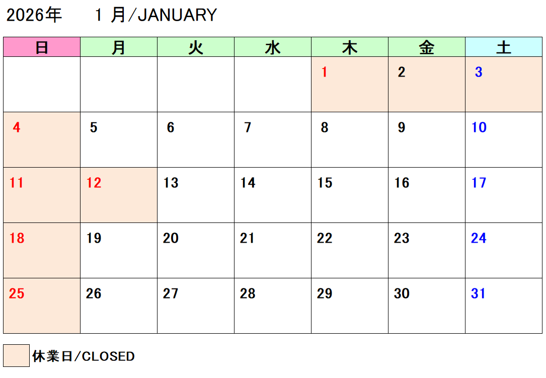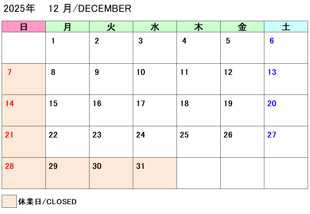 Closed days: Sundays and Japanese holidays
