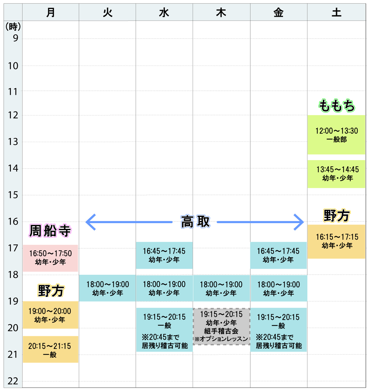 | 金 | 〇高取本部 16:45~17:45(幼年・少年クラス) 18:00~19:00(幼年・少年クラス) 19:15~20:15(一般クラス)※20:45まで居残り稽古可能 |